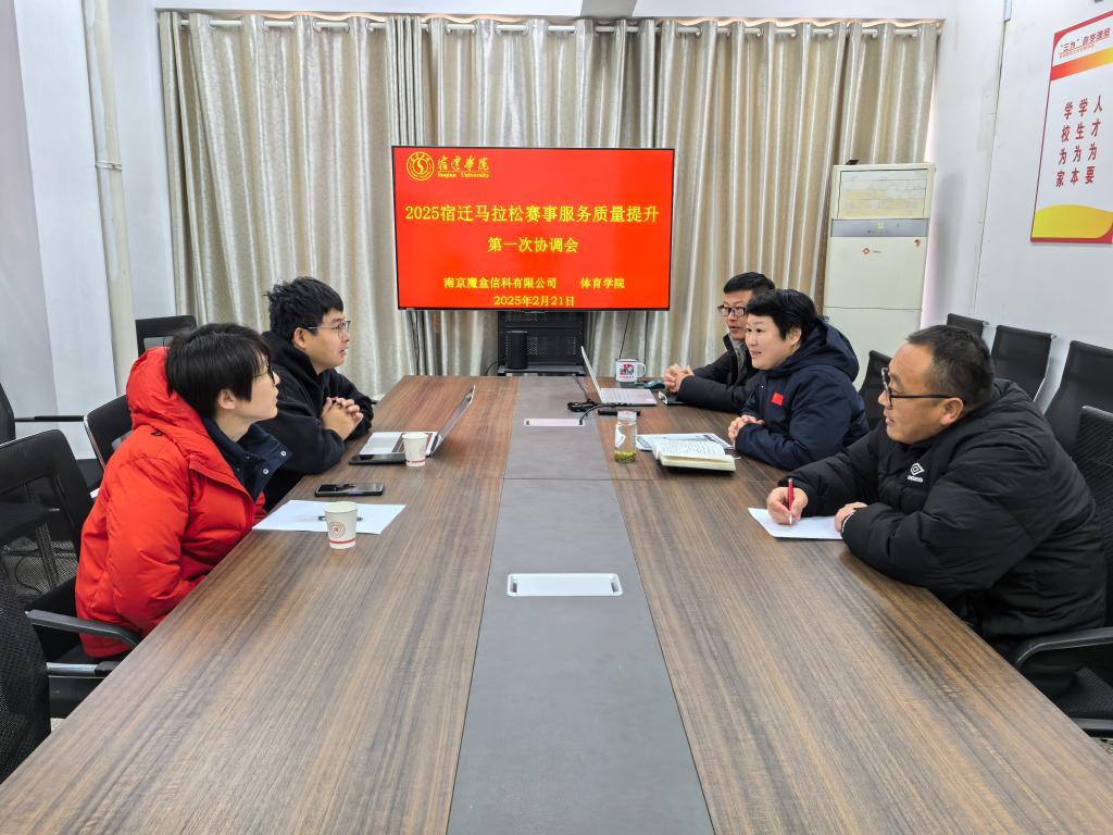为高质量做好2025宿迁马拉松赛事服务工作,2025年2月21日上午2025宿迁马拉松赛事服务质量提升第一次协调会在我院举行。本次赛事负责人、南京魔盒信息科技有限公司郑鑫,竞赛负责人池路杰,赛事主管、体育学院院长于华,体育学院部分教师参加了会议。会议由体育学院副院长刘尚礼主持。